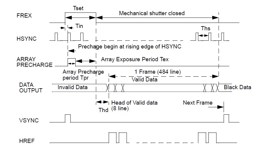 OV7120 features: (1)326,688 pixels, 1/3” lens, VGA/QVGA format; (2)Progressive scan/Interlaced scan; (3)8-bit/16-bit Data output formats - YCrCb 4:2:2 ITU-656, IR 601 GRB 4:2:2 & RGB Raw Data; (4)Wide dynamic range, anti-blooming, zero smearing; (5)Electronic exposure/gain/white balance control; (6)Image controls - brightness, contrast, gamma, saturation, sharpness, windowing, hue, etc.; (7)Internal & external synchronization; (8)Line exposure option; (9)5 Volt operation, low power dissipation.