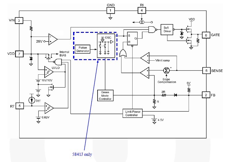 SG5841DZ features: (1)Green-Mode PWM Controller; (2)Low Start-Up Current (14μA); (3)Low Operating Current (4mA); (4)Programmable PWM Frequency with Hopping; (5)Peak-Current-Mode Control; (6)Cycle-by-Cycle Current Limiting; (7)Synchronized Slope Compensation; (8)Leading-Edge Blanking; (9)Constant Output Power Limit; (10)Totem Pole Output with Soft Driving; (11)VDD Over-Voltage Clamping; (12)Programmable Over-Temperature Protection (OTP); (13)Internal Open-Loop Protection; (14)VDD Under-Voltage Lockout (UVLO); (15)GATE Output Maximum Voltage Clamp (18V).